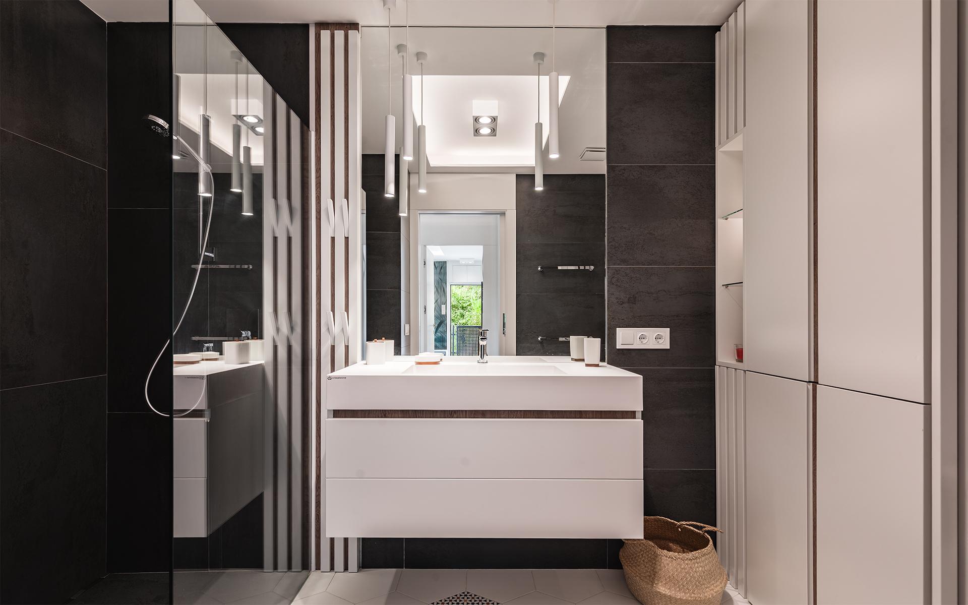 The upper floor is dedicated to the master suite, which offers a bright bedroom, a bathroom with bathtub and shower, a walk-in wardrobe, and a private terrace with stunning views.