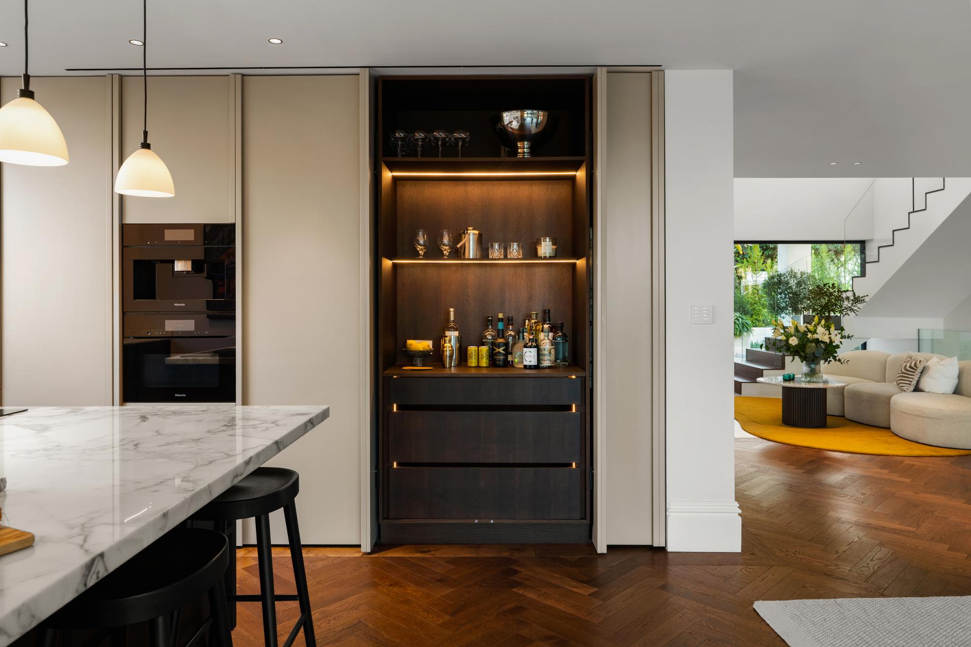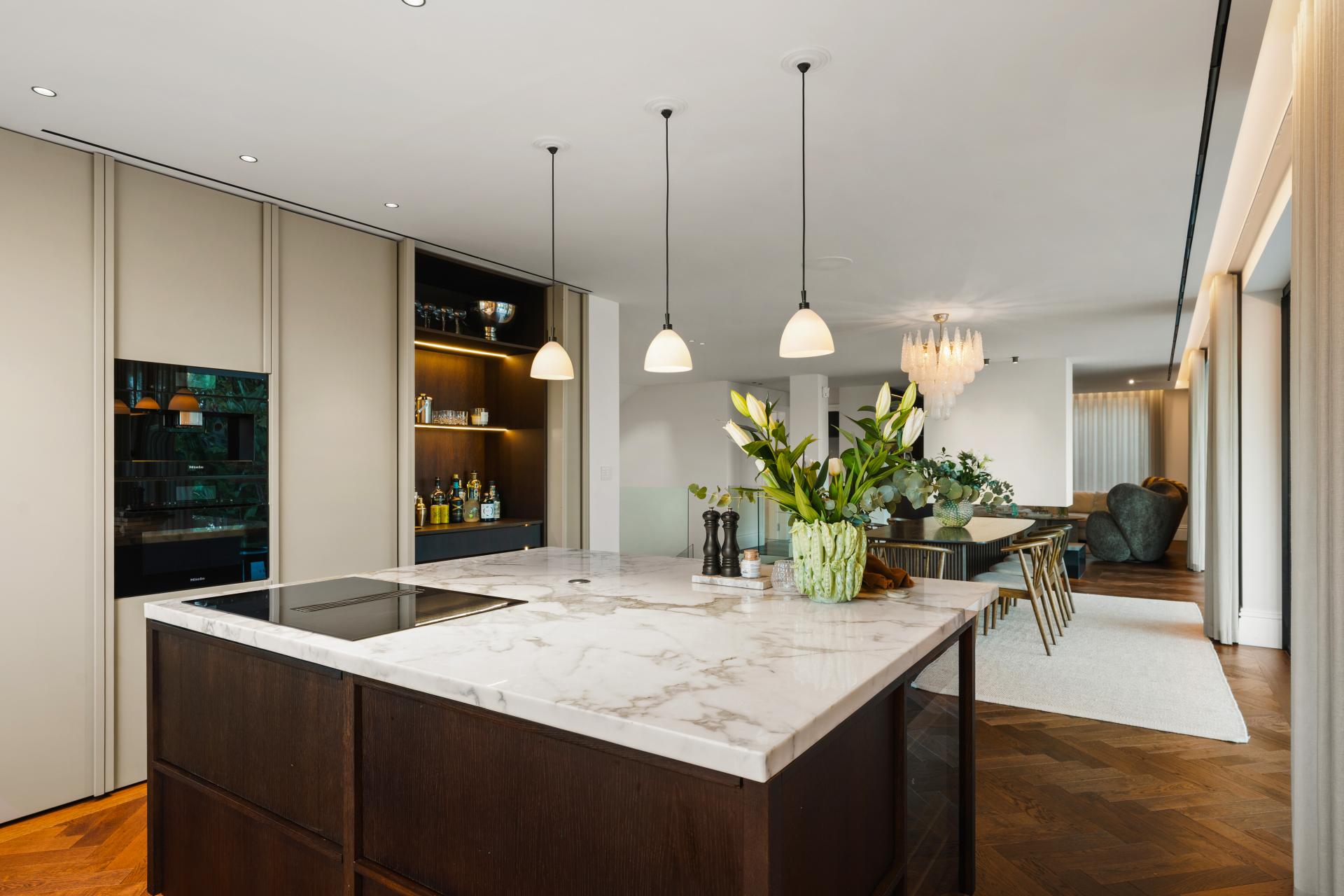 The kitchen is fitted with top of the line Miele appliances and complemented by a stylish dry bar. A separate, concealed chef’s kitchen/scullery provides a highly practical extension, ideal for hosting and preparing meals while maintaining the elegance of the main living space.