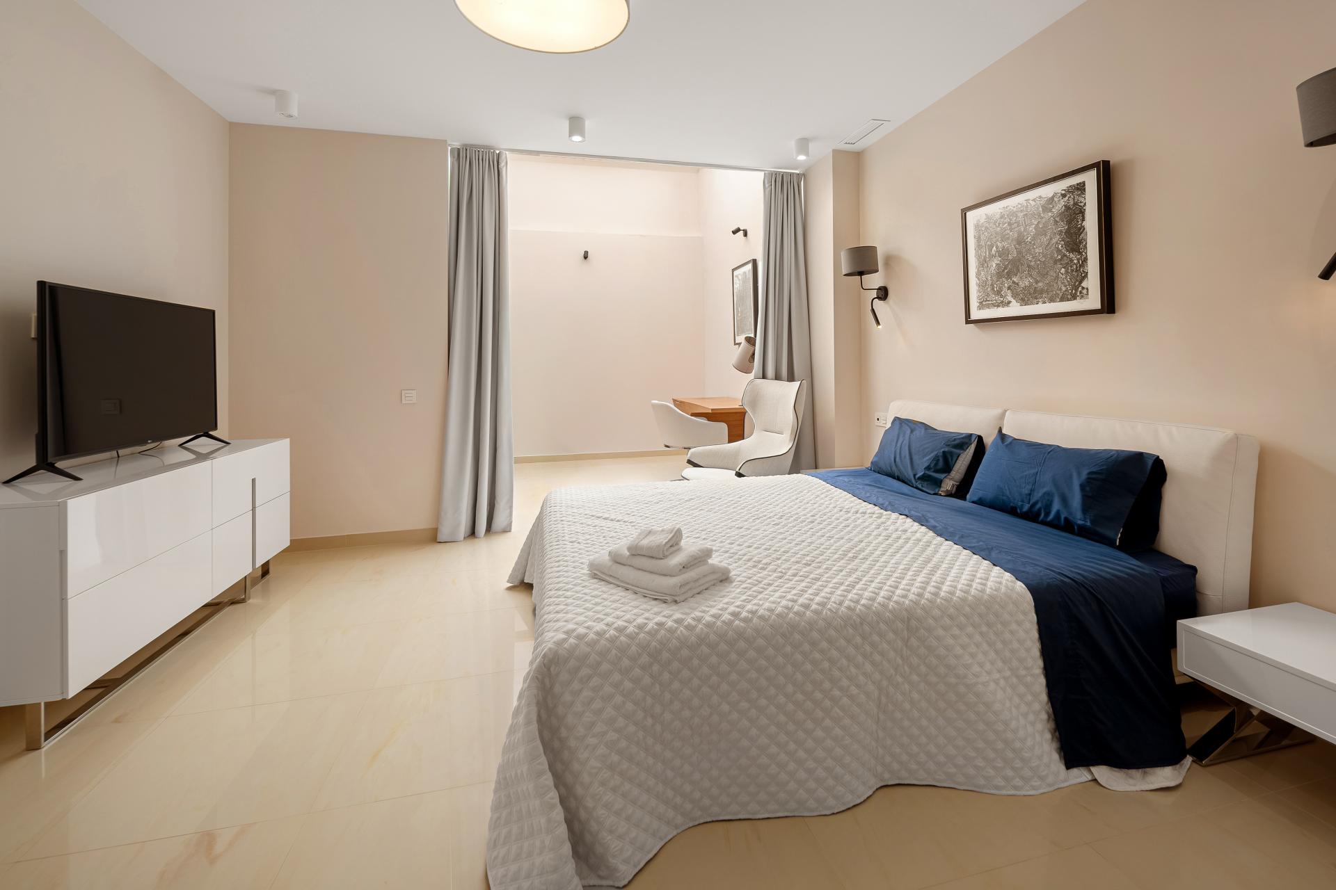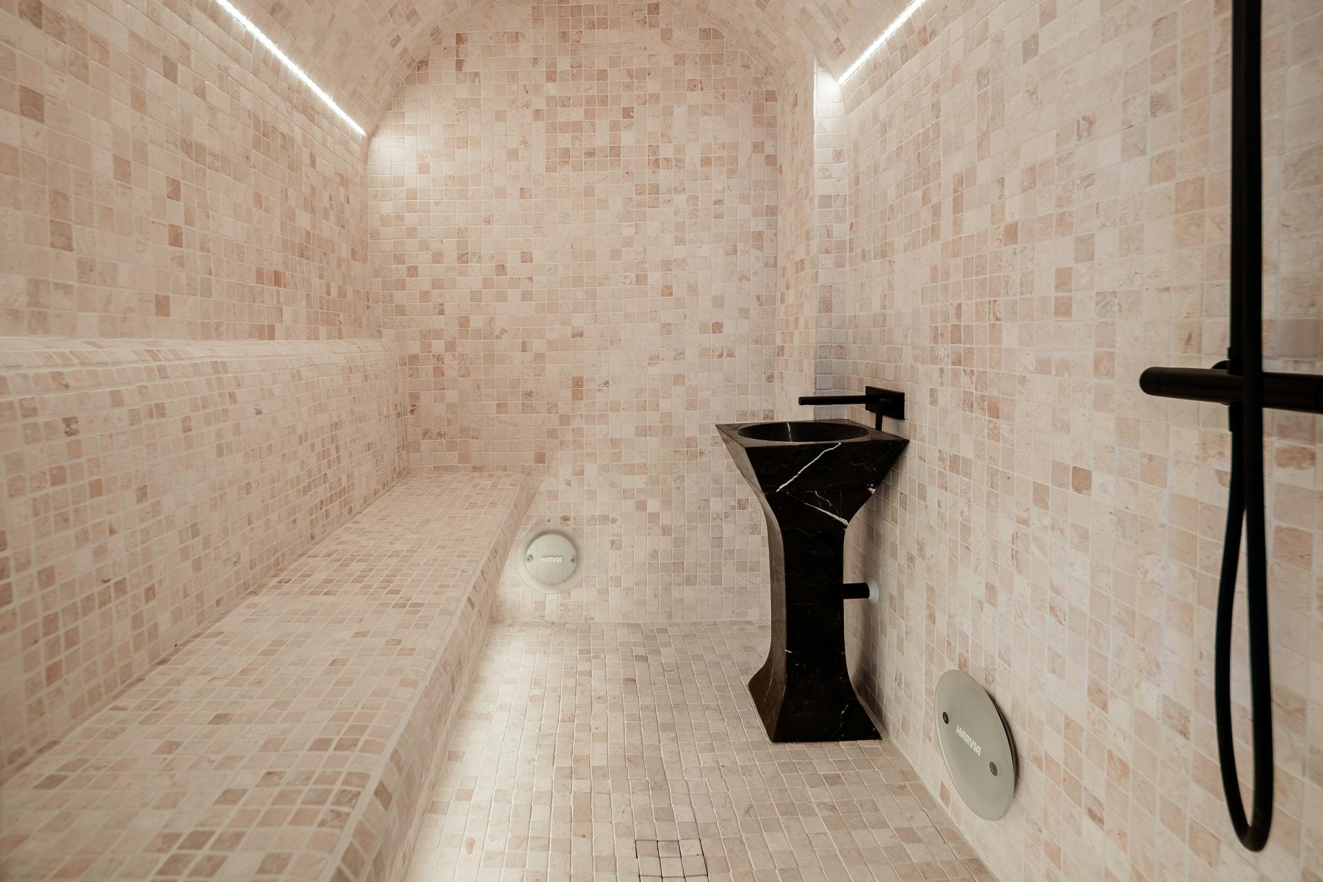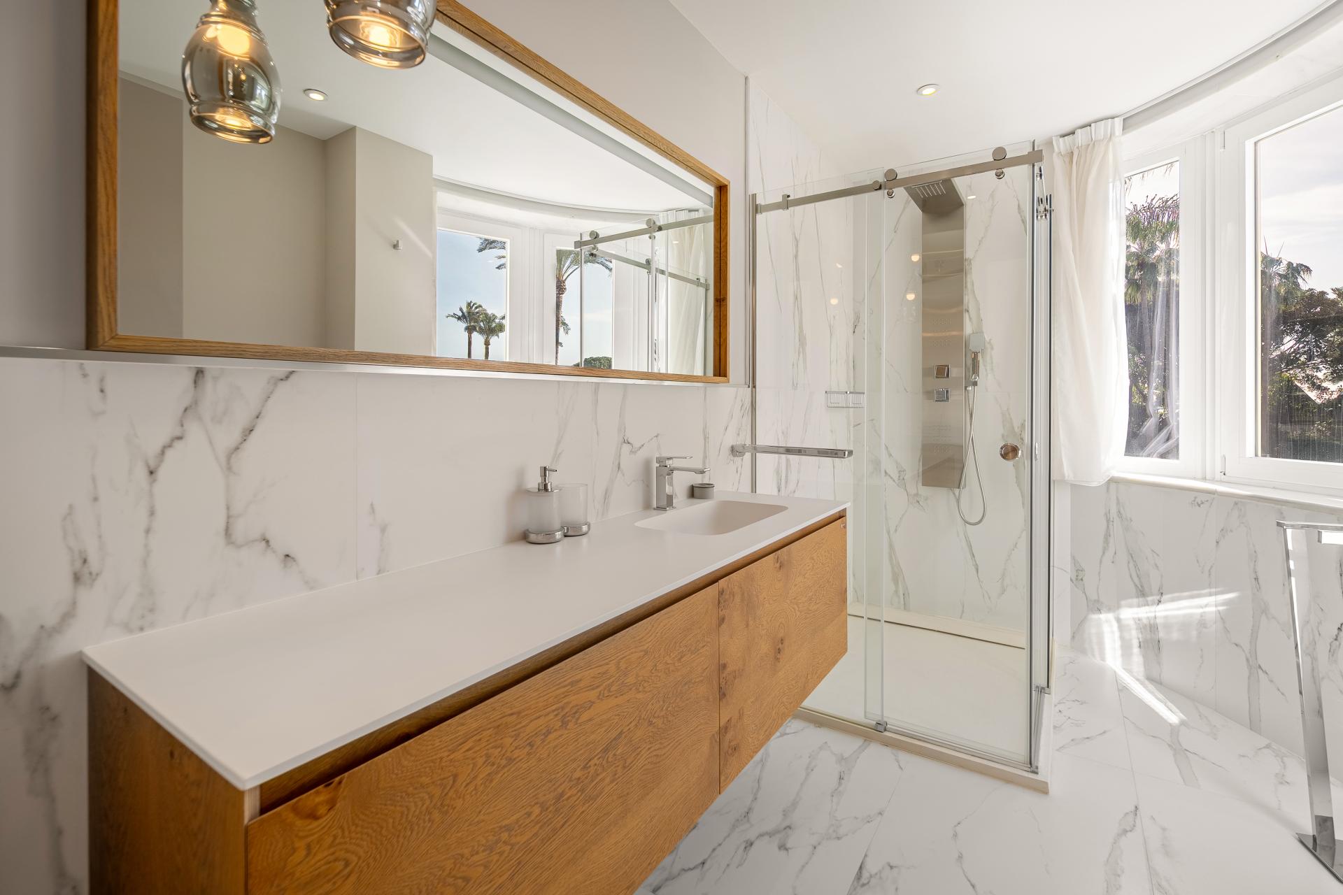 The garden-level floor comprises a bright living room with an open kitchen, opening onto a spacious terrace, ideal for enjoying the Mediterranean climate. This level also includes two en-suite bedrooms, a laundry room, and a hammam, inviting relaxation and well-being.