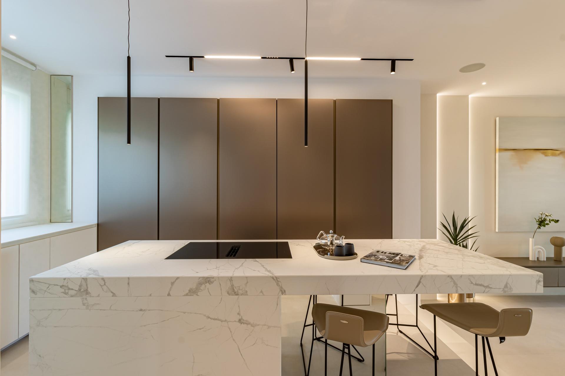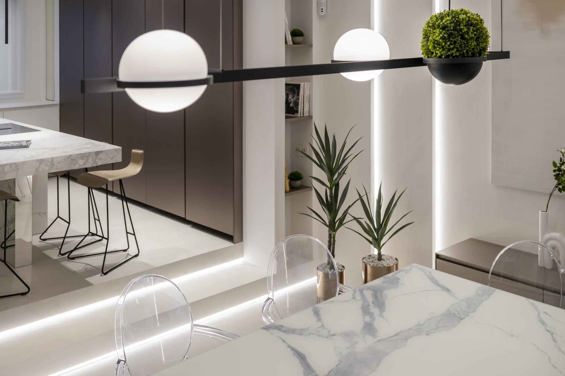 Pour garantir un confort en toute saison, la maison est équipée de la climatisation réversible. Les fenêtres à double vitrage assurent efficacité énergétique et isolation phonique, tandis que le système d’éclairage LED sophistiqué permet de créer une ambiance personnalisée. Elle dispose également d’un système domotique, d’un sauna à vapeur, d’une cheminée à bois et à vapeur, ainsi que d’un chauffage au sol hydraulique. Les marques utilisées pour la rénovation sont de prestige : Modulnova, Rimadesio, B&B Italia, Flexform, Vibia, Porcelanosa, Tempur, NEFF et Gaggenau.